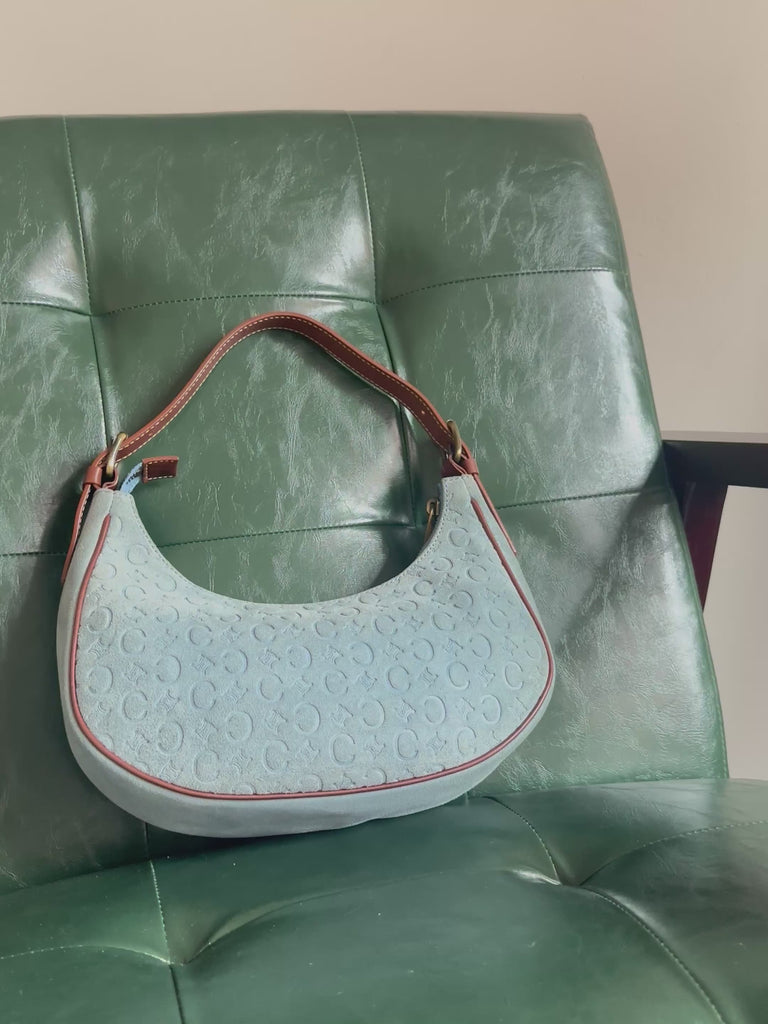 Introducing the Celine Ava bag - a stunning half moon shoulder bag in pale blue suede with a brown leather trim and aged gold hardware. The suede features little embossed Celine logos. It's super cute.