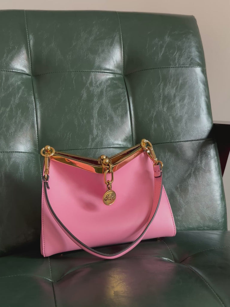 Introducing the Etro Vela bag in size small, pink calfskin leather. Another bubblegum pink number, Italian brand Etro has been around since 1968. The Vela bag was launched in March 2023 and has been a sellout success.